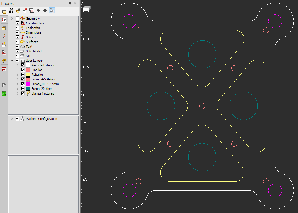 Depois vamos dividir os desenhos de dentro, sendo circulos ou pocketings. Se é um circulo vai para a layer CIRCULOS. Se não vai ser um REBAIXE.