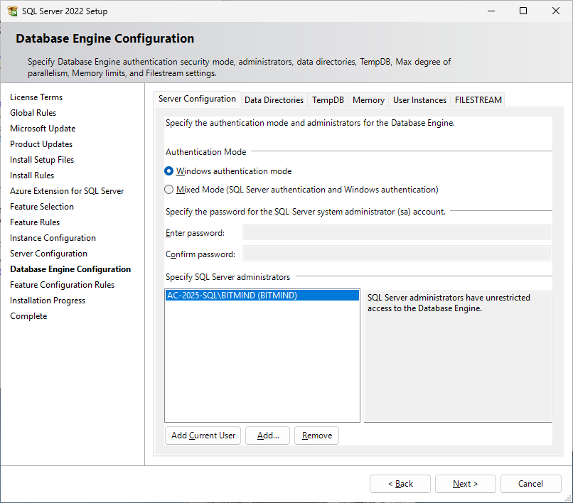 Agora, na configuração de passwords, deixe como Windows Authentication mode - NEXT