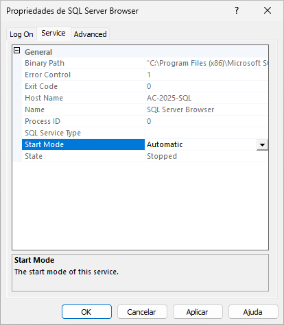 Dentro de SQL Server Services, clique com o botão direito nas propriedades de SQL Server Browser