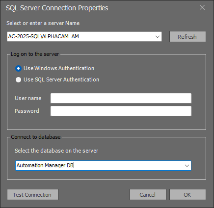 Adicione as informações do nome do servidor e a instância onde está a base de dados e em qual base de dados será instalada, no caso, Automation Manager DB.