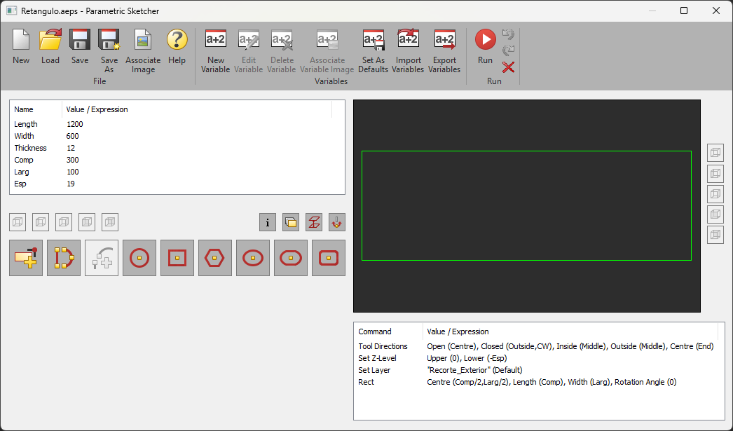 No exemplo simples à seguir, temos um paramétrico de um retângulo com algumas variáveis, por exemplo, Comp(Comprimento), Larg(Largura e Esp(Espessura). Podemos, do mesmo modo, utilizar as variáveis padrão Length, Width e Thickness.