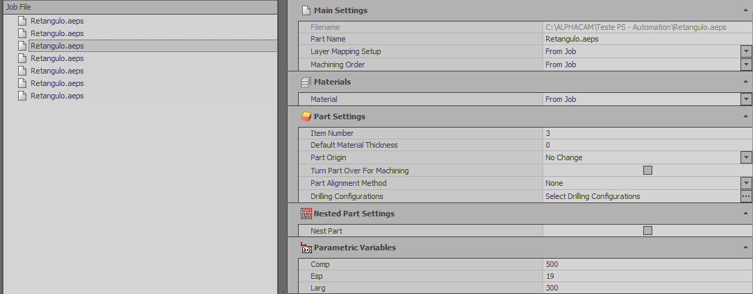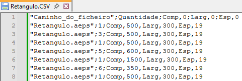 Com o ficheiro pronto para receber os parâmetros, nosso CSV terá de informação: Caminho do ficheiro, Quantidade e os parâmetros de dimensões da peça, seguindo a seguinte ordem: