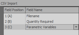 Depois disso, vamos configurar os campos. Neste caso temos que adicionar 3 campos, FILE NAME, QUANTITY e PARAMETRIC VARIABLES. Para isso clique em ADD COLUMN FIELD e altere o campo. cada FIELD POSITION corresponde à um campo do CSV que está antes do ";" (ponto e vírgula).
